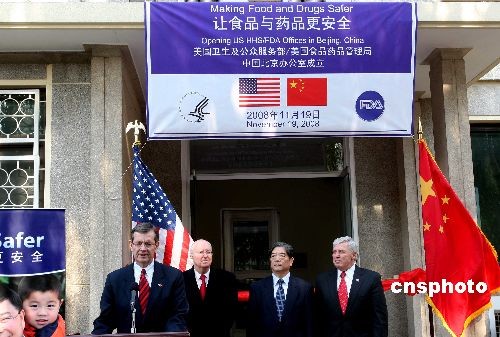 11月19日,美國食品藥品監(jiān)督管理局(FDA)在中國的首個辦事處在北京成立,美國衛(wèi)生和公共服務部部長萊維特(左)、中國衛(wèi)生部副部長邵明立(右二)、美國食品藥品管理局局長埃森巴赫(右)等出席該機構(gòu)成立儀式。中新社發(fā)張宇 攝