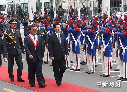 中國國家主席胡錦濤二十日在秘魯國會大廈前檢閱秘魯三軍儀仗隊。中新社記者 齊彬攝