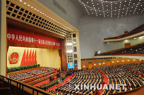 3月15日,十一屆全國(guó)人大一次會(huì)議在北京人民大會(huì)堂舉行第五次全體會(huì)議,選舉第十一屆全國(guó)人民代表大會(huì)常務(wù)委員會(huì)委員長(zhǎng)、副委員長(zhǎng)、秘書(shū)長(zhǎng);選舉第十一屆全國(guó)人民代表大會(huì)常務(wù)委員會(huì)委員;選舉中華人民共和國(guó)主席、副主席;選舉中華人民共和國(guó)中央軍事委員會(huì)主席。這是大會(huì)會(huì)場(chǎng)。新華社記者 楊宗友 攝