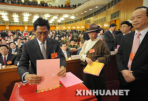3月15日,十一屆全國人大一次會議在北京人民大會堂舉行第五次全體會議,選舉第十一屆全國人民代表大會常務委員會委員長、副委員長、秘書長;選舉第十一屆全國人民代表大會常務委員會委員;選舉中華人民共和國主席、副主席;選舉中華人民共和國中央軍事委員會主席。這是來自西藏的全國人大代表嘎瑪仁青(藏族)在投票。新華社記者馬占成攝