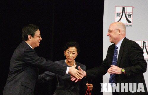 4月20日,中國駐美國大使周文重(左)與美國財(cái)政部長保爾森在百人會第16屆年會上握手。