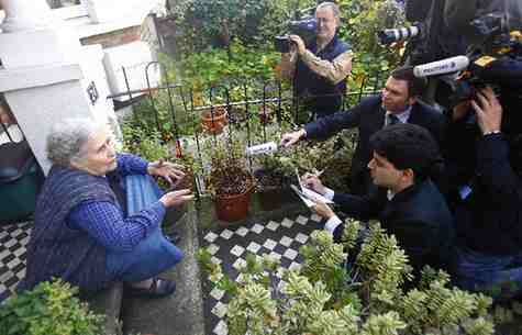 10月11日,萊辛在倫敦住宅門外與媒體記者交談