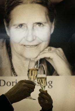 德國霍夫曼·坎佩出版社的兩名職員舉杯慶祝萊辛獲獎