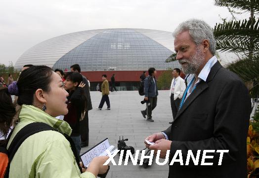 10月10日,丹麥政治報(bào)記者奧爾森在國(guó)家大劇院前接受新華社記者采訪。當(dāng)日,前來(lái)采訪中國(guó)共產(chǎn)黨第十七次全國(guó)代表大會(huì)的40多家境外媒體的120多位記者在北京參觀國(guó)家大劇院。新華社記者龐興雷 攝
