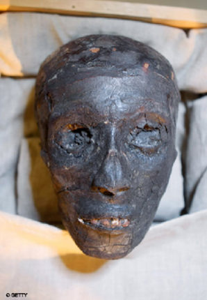 由于經(jīng)過防腐處理加之年代久遠(yuǎn),圖坦卡蒙的面部肌肉早已萎縮干枯,如一層黑色皮革覆蓋在頭骨上,但是他的整個(gè)臉面完整無缺,光滑平整,還有明顯突出的齙牙,這完全符合圖坦卡蒙家族的相貌特征——牙齒咬合時(shí)上排門牙明顯覆蓋下牙。如果與法國(guó)、埃及、美國(guó)三國(guó)科學(xué)家在2005年根據(jù)電腦斷層掃描(CT掃描)照片復(fù)原的圖坦卡蒙長(zhǎng)相比較,也會(huì)發(fā)現(xiàn)兩者有著驚人相似。