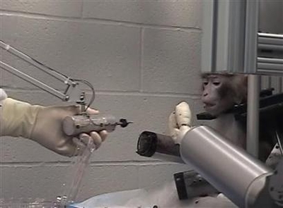 據(jù)英國《泰晤士報(bào)》5月29日?qǐng)?bào)道,這項(xiàng)試驗(yàn)是由美國匹茲堡大學(xué)醫(yī)學(xué)院的研究小組完成的。在試驗(yàn)中,研究人員在猴子的大腦中安裝了若干個(gè)只有半個(gè)圖釘大小的顯微電極,并通過其與一只機(jī)械手臂相連,這只手臂可以接受猴子大腦所發(fā)送出來的不同電波信號(hào)并進(jìn)行“破譯”,從而做出各種不同的動(dòng)作。