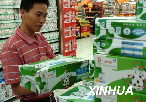 9月28日,市民在超市選購(gòu)“放心奶”。近日,質(zhì)檢總局對(duì)??谑懈鞔蟪泄?yīng)的液態(tài)奶、酸乳、巴氏殺菌乳、滅菌乳等乳制品進(jìn)行了三聚氰胺抽樣檢測(cè),均未檢出三聚氰胺。為了讓百姓購(gòu)買乳制品能夠明白、放心,??谑懈鞔蟪袑?duì)通過檢驗(yàn)的各類乳制品打出了檢驗(yàn)合格標(biāo)牌。新華社記者郭程攝
