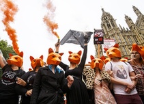 當?shù)貢r間2015年7月14日,英國倫敦,動物保護者帶狐貍面具舉行游行示威,反對政府恢復狐貍捕殺法案。