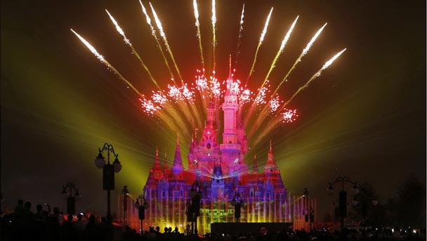 2016年5月25日,中國上海,夜幕降臨,上海迪士尼“奇幻童話城堡”在萬千煙火的照耀下光彩迷人,空中絢爛的煙花在湖中倒影絕美。