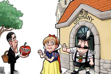 美國總統(tǒng)奧巴馬到訪德國,數(shù)萬德國民眾走上漢諾威街頭,抗議歐美醞釀中的TTIP協(xié)定。
