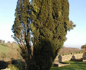 Perhaps the yew tree, which begins again with new roots after the older tree has rotted away and therefore lasts for many centuries, has a pre-Christian tradition. It is certainly difficult to ascertain the importance to Welsh history of the Overton yew trees and their inclusion in the nursery rhyme unless one considers the honoured place of Welsh mercenary soldiers in the armies of England. Yew's elastic properties made it the ideal wood for the longbow, for over three centuries the main weapon of the English army. The English King Edward I is said to have decreed that yews trees should be planted in all English churchyards to provide a plentiful supply of wood for the longbow. To effectively utilize its power, a large body of archers was recruited in Wales, a country with a long military tradition, and where the longbow may have been first developed. In the 14th century, these soldiers were paid six pence a day, much more than they could ever have earned on the farms or in the mills in their home villages.