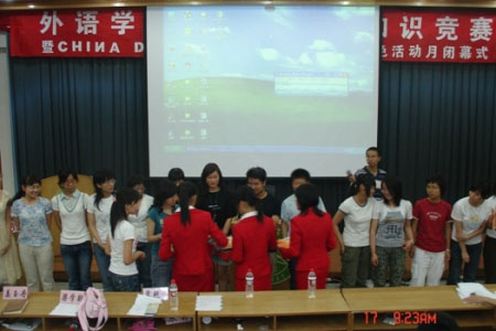Daily”杯——第二屆百科知識(shí)競(jìng)賽暨“你身邊的奧運(yùn)”特色活動(dòng)月閉幕式在林業(yè)大學(xué)東配樓大報(bào)告廳成功舉行。首先由學(xué)生會(huì)秘書(shū)長(zhǎng)致辭,總結(jié)了奧運(yùn)活動(dòng)月的經(jīng)驗(yàn)及成績(jī);隨后,知識(shí)競(jìng)賽便正式開(kāi)始。競(jìng)賽分為淘汰賽和終極PK賽兩輪進(jìn)行。經(jīng)過(guò)激烈的淘汰賽,最后六支隊(duì)伍順利晉級(jí)終極PK賽。經(jīng)過(guò)又一輪緊張有序的競(jìng)爭(zhēng),最終英語(yǔ)06-3班摘得冠軍,英語(yǔ)06-1班和英語(yǔ)05-4班分獲二、三等獎(jiǎng)。比賽中不僅有在場(chǎng)選手的精彩表現(xiàn),還穿插了觀眾互動(dòng)等活動(dòng)。各班啦啦隊(duì)口號(hào)響亮,在場(chǎng)的觀眾激情無(wú)限。