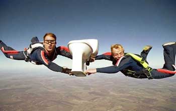 Skydiving is a team sport. Two people are in the team, a skydiver and a video camera operator. The video camera operator videotapes the skydiver while the skydiver does gymnastics. After they've landed, the judge watches the videotape. The team gets point for good gymnastics in the air and good skydiving.