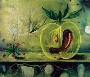 Baby insects are also digging their way through the apple. A Venus flytrap plant is ready to catch a nearby fly. The yellow and green colors give the painting a strange and upsetting mood.