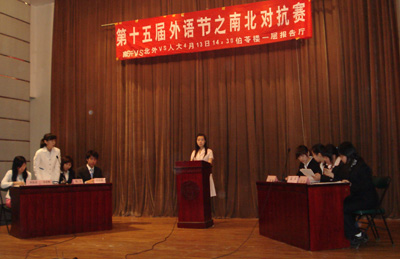 南開大學(xué)第十五屆外語節(jié)之南北對(duì)抗賽4月13日在南開大學(xué)伯苓樓一層報(bào)告廳舉行。北京外國語大學(xué)和人民大學(xué)分別派隊(duì)參加了本次比賽,與南大學(xué)子同場(chǎng)競(jìng)技。南開大學(xué)外國語學(xué)院James、王慶勇老師等擔(dān)任大賽評(píng)委,院團(tuán)委李娜老師等同全場(chǎng)觀眾一起觀看了這場(chǎng)精彩的辯論。