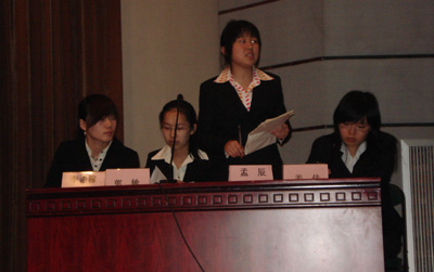 本次英文辯論賽分兩場(chǎng)進(jìn)行。第一場(chǎng)辯題為“Should Homosexual Marriage Be Allowed By Law(法律是否應(yīng)允許同性戀婚姻)”,北京外國語大學(xué)和南開大學(xué)代表隊(duì)分別作為正反方進(jìn)行了激烈的辯論,結(jié)果南大代表隊(duì)惜敗。但在第二場(chǎng)與人民大學(xué)辯題為“Should STARBUCK Be In the Forbidden City”的辯論中,南開大學(xué)代表隊(duì)的四位辯手憑借出色的口語表達(dá)和臨場(chǎng)應(yīng)變能力取得了勝利。