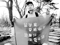 記者昨天下午在北大未名湖邊見到了竇蔻,他身穿一件夾克,手里拿著一個(gè)紅旗,上寫著“留學(xué)前穿越中國,迎奧運(yùn)竇蔻年華”。竇蔻稱,之前的旗桿是特意制作的,非常漂亮,這個(gè)旗桿在路上行走時(shí)被公交車刮斷了,自己只好揀了一根竹竿代替。