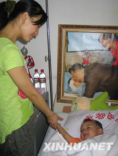 “郎錚弟弟,歡迎你”小郎錚抬進病房后,唐都醫(yī)院特意安排和他同室的北川李全波姐姐就用四川鄉(xiāng)音熱情地打招呼。小郎錚讓媽媽將溫家寶爺爺親吻他的照片放在床頭后,圓圓的頭擺來擺去,左瞧瞧右看看,還時不時對陪同他的媽媽和姑媽甜甜地笑一下,周圍的人都憐愛地摸摸他的小手,夸孩子可愛。送小郎錚回來的唐都醫(yī)院救援隊隊員張勇副教授告訴記者,小郎錚在地震中受到驚嚇后恐慌煩躁,常從夢中嚇醒,哭鬧不停。為安撫小郎錚的情緒,醫(yī)護人員在他身邊照看安撫,才使小郎錚左手小拇指和無名指的部分截肢手術(shù)成功實施。