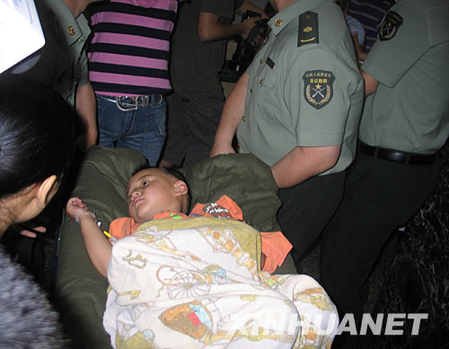 5月25日,3歲的北川縣男孩郎錚被醫(yī)護人員送入病房。