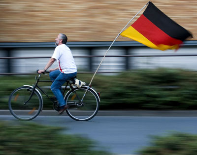 A Germany fan rides his bicycle after the World Cup soccer match between Germany and Sweden, in downtown Frankfurt June 24, 2006. (Reuters)