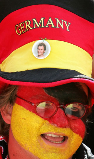 A soccer fan of the German team follows a World Cup soccer match between Germany and Sweden during a screening on the boulevard 'Strasse des 17 Juni' at the so-called 'Fan Mile' in Berlin June 24, 2006. (Reuters)