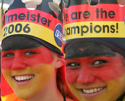 Soccer fans of the German team celebrate during a screening of the World Cup soccer match between Germany and Sweden on the boulevard 'Strasse des 17 Juni' at the so-called 'Fan Mile' in Berlin June 24, 2006. (Reuters)