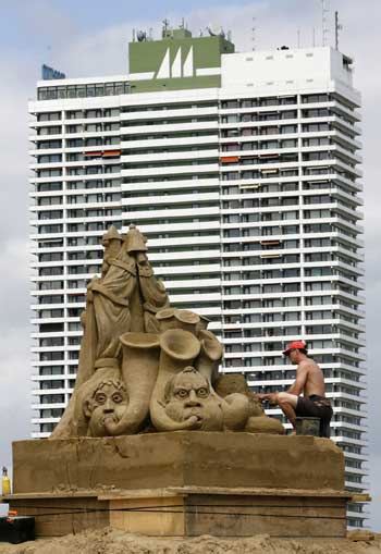 Russian sand sculptor Ilya Shanin works on a sculpture called "Circus Orchestra" in front of a huge hotel building during the Sand Sculpture Festival "Sand World" in Travemuende near Luebeck June 29, 2006. (Reuters)
