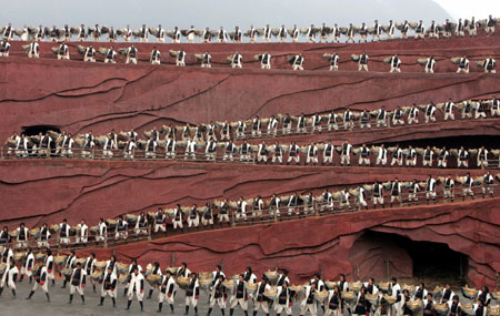 Performers dressed in ethnic costumes dance in an outdoor production called "Impression Lijiang", held on a manmade stage on the Jade Dragon Snow Mountain, 3,100m (10,170 feet) above sea level, near Lijiang city in southwestern China's Yunnan province July 23, 2006. About 500 amateur performers from 10 ethnic minority groups took part in the $31-million production by acclaimed Chinese director Zhang Yimou. (Reuters)