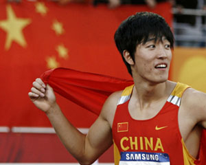 World record holder China's Liu Xiang holds his national flag as he celebrates after winning the men's 110m hurdles final during the 15th Asian Games in Doha December 12, 2006.