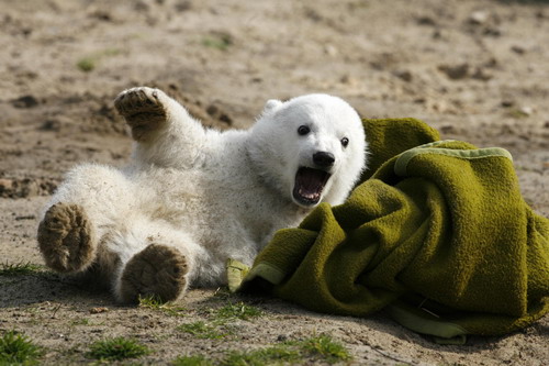 Polar bear cub Knut plays with a blanket during the bear's first presentation in Berlin zoo March 23, 2007. Knut, born on December 5, 2006, had to be hand fed every four hours by Doerflein after its mother Tosca refused the baby.