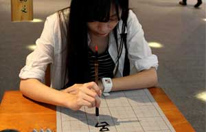 Visitors enjoy artwork at the 4th Cross-Straits Chinese Character Art Festival in Taipei, Southeast China's Taiwan, September 4, 2013.