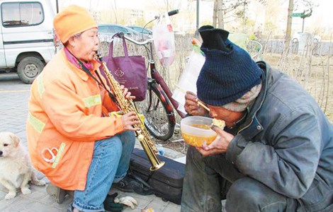 It was an ordinary summer morning in June in Datong, Shanxi province. An elderly woman wearing the uniform of a city cleaner was sitting on the street corner playing the saxophone.