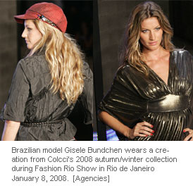 Brazilian model Gisele Bundchen wears a creation from Colcci's 2008 autumn/winter collection during Fashion Rio Show in Rio de Janeiro January 8, 2008. [Agencies]