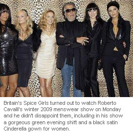 Britain's Spice Girls turned out to watch Roberto Cavalli's winter 2009 menswear show on Monday and he didn't disappoint them, including in his show a gorgeous green evening shift and a black satin Cinderella gown for women.
