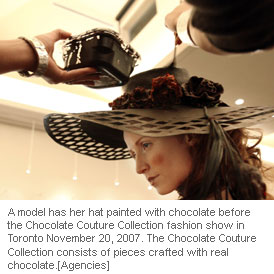A model has her hat painted with chocolate before the Chocolate Couture Collection fashion show in Toronto November 20, 2007. The Chocolate Couture Collection consists of pieces crafted with real chocolate.[Agencies]