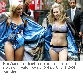 Two Queensland tourism promoters cross a street in their swimsuits in central Sydney June 11, 2008.[Agencies]