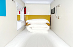 A guest erects a collapsible desk in a "capsule" hotel in Chongqing, southwest China.