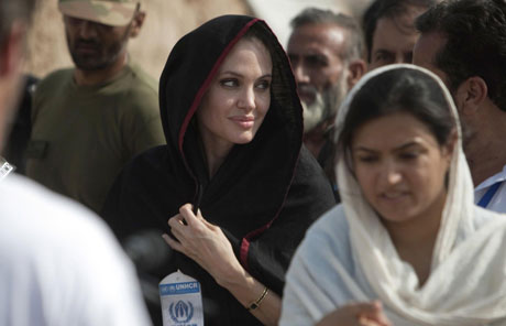Actress Angelina Jolie wears a headscarf as she arrives at the Jalozai flood victim relief camp.