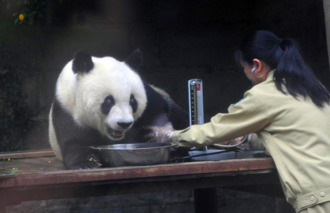 Giant panda Basi plays at a zoo in Fuzhou city, capital of East China’s Fujian province, May 21, 2015.