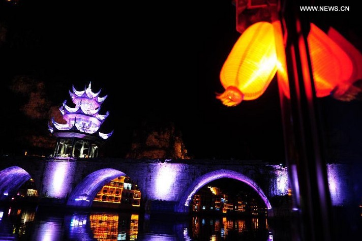 Photo taken on Aug. 5, 2013 shows a night scenery of Zhenyuan Ancient Town in southwest China's Guizhou Province. Known as "Oriental Venice", Zhenyuan Ancient Town witnessed a tourism peak this summer. (Xinhua/Liu Xu)