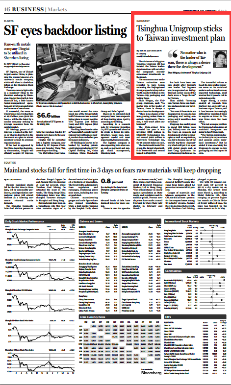 The chairman of chip giant Tsinghua Unigroup Ltd has insisted the Taiwan leadership transition will not affect the company's recently announced investments on the island.