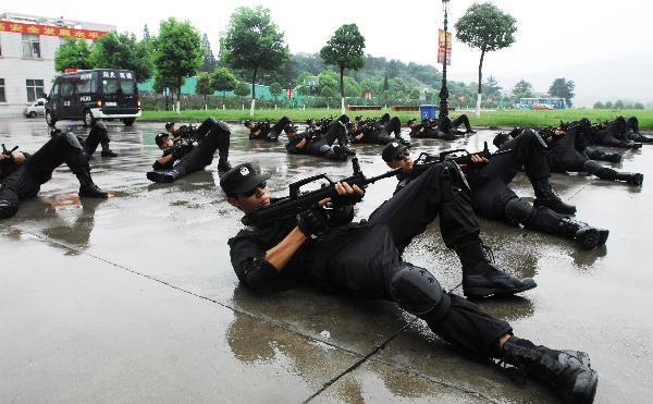 Special policemen perform military skills for citizens during the activity of the "police station opening day" in Xiangfan City, central China's Hubei Province, July 22, 2010. A total of 30 students and parents visited the special police detachment of Xiangfan police for the first time on Thursday. The activity of "police station opening day" helped enhance children's awareness of national defence and their understanding of special police during the summer vacation. (Xinhua/An Fubin)