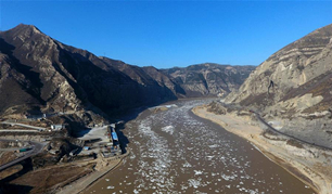 Pieces of ice drifted down the Longmen section of the Yellow River at the intersection of Hejin county in Shanxi province and Hancheng county in Shaanxi province, Dec 7.
