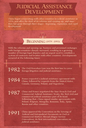 China currently has treaties on civil and commercial judicial assistance with 13 countries and has treaties on civil and criminal judicial assistance and treaties on civil, commercial and criminal judicial assistance with 19 countries.