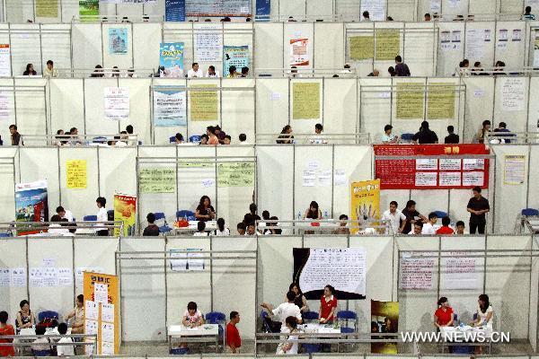 Job hunters seek vacancies at a job fair for college graduates in Tianjin, north China, Aug. 14, 2010. More than 500 companies offered on Saturday over 10,000 jobs at the fair. Tianjin will arrange a job fair of the kind each month in the rest of the year. (Xinhua/Liu Dongyue)