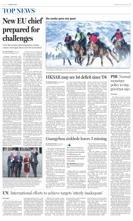 Three people remained missing as of Monday evening after the ground gave way in downtown Guangzhou, Guangdong province, according to local authorities. Search and rescue operations are underway.