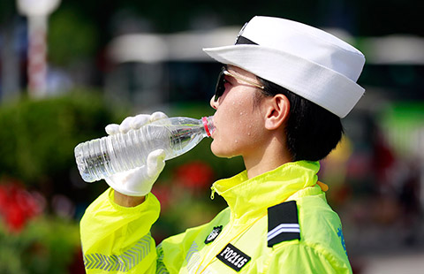 Two workers in yellow insulated clothes carry out inspection of high-voltage power lines in Jinhua, Zhejiang province, July 11, 2017.[Photo/VCG]