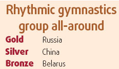 Russia wrapped up their third straight rhythmic gymnastics group all-around gold yesterday, while China finished second for their first medal in the crowd-pleasing discipline.
