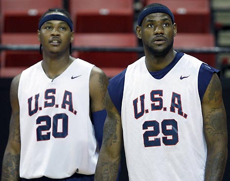 USA team members LeBron James (R) and Carmelo Anthony practice for the FIBA Americas regional qualifying basketball tournament to decide two berths for the 2008 Beijing Olympics, in Las Vegas August 21, 2007. The top two teams in the tournament will qualify for the 2008 Beijing Olympics. [Reuters]