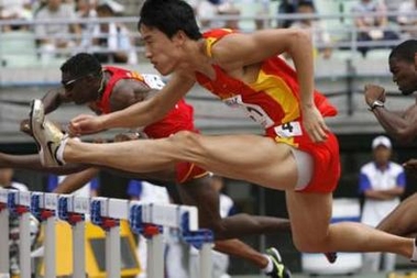 China's Liu Xiang (front) competes in the men's 110 metres hurdles heats at the 11th IAAF World Athletics Championship in Osaka August 29, 2007. [Reuters] |